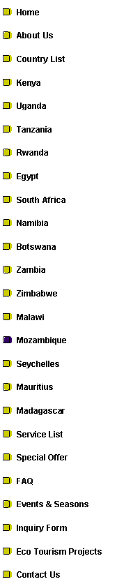 There are a number of islands offering excellent island getaways with diving and snorkelling along magnificent coral reefs. Best known is the Bazaruto Archipelago - Magaruque, Benguera, Bazeruto and Santa Carolina (Paradise Island). The official language is Portugese and cultures include European, Shangaan, Chokwe, Manyika, Sena and Makua. The local currency is the Metical. Please consult your local embassy with regard to visa requirements. In the capital city of Maputo formerly Lourenco Marques, you are never far from the coast and visitors to the city can enjoy the refreshing sea breeze at the many restaurants serving locally caught seafood. Along the marginal is the fish market, where you will find fresh fish for the barbeque without all the effort of catching it. Only a day trip away are the beaches of Macaneta and Island of Inhaca, a popular spot for diving and snorkeling.